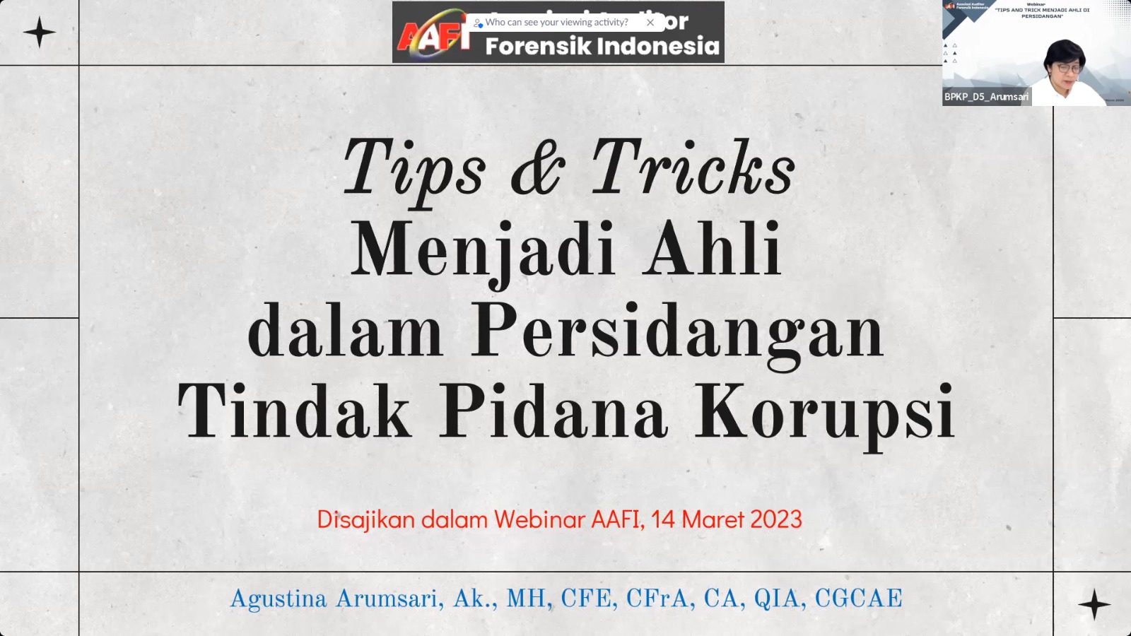 Terkait hal itu, AAFI WENOME menggelar webinar bertajuk Tips and Tricks Menjadi Ahli di Persidangan yang menghadirkan Ibu Agustina Arumsari, Ak., M.H., CFE, CFrA, CA, QIA, CGCAE (Deputi Investigasi BPKP) sebagai Narasumber dan Ibu Dr. Selvia Vivi Devianti S.E., M.Sc., MCP., Ak, CFrA, CFE, CSFA (Direktur Litbang BPK RI) selaku Moderator.�