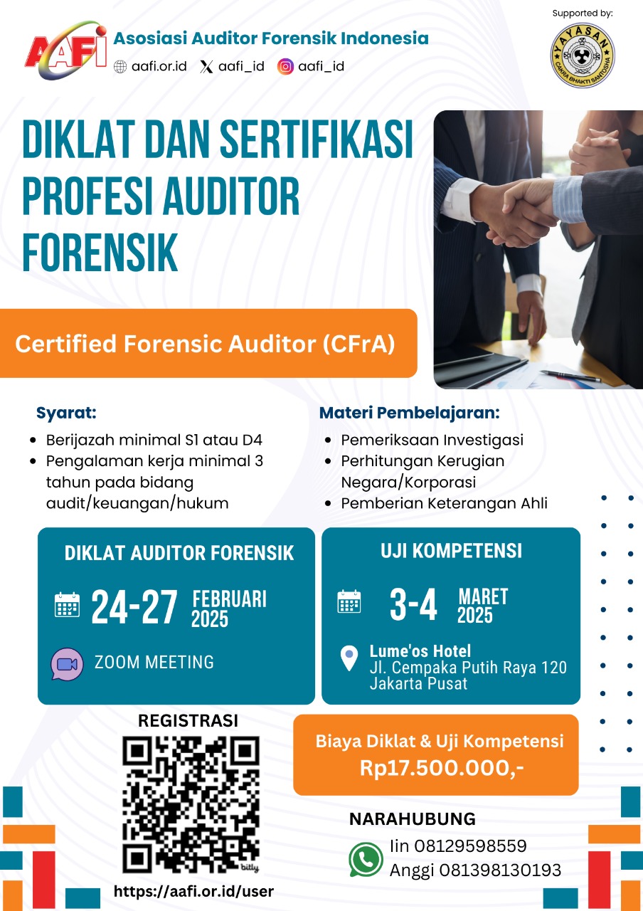 Asosiasi Auditor Forensik Indonesia Wenome (AAFI WENOME), dengan dukungan dari Yayasan Cakra Bhakti Santosha, kembali mengadakan Diklat dan Sertifikasi Profesi Auditor Forensik dengan gelar Certified Forensic Auditor (CFrA). Program ini bertujuan untuk meningkatkan kompetensi para auditor dalam bidang audit investigatif dan forensik guna mendukung upaya pemberantasan tindak pidana keuangan dan korupsi.