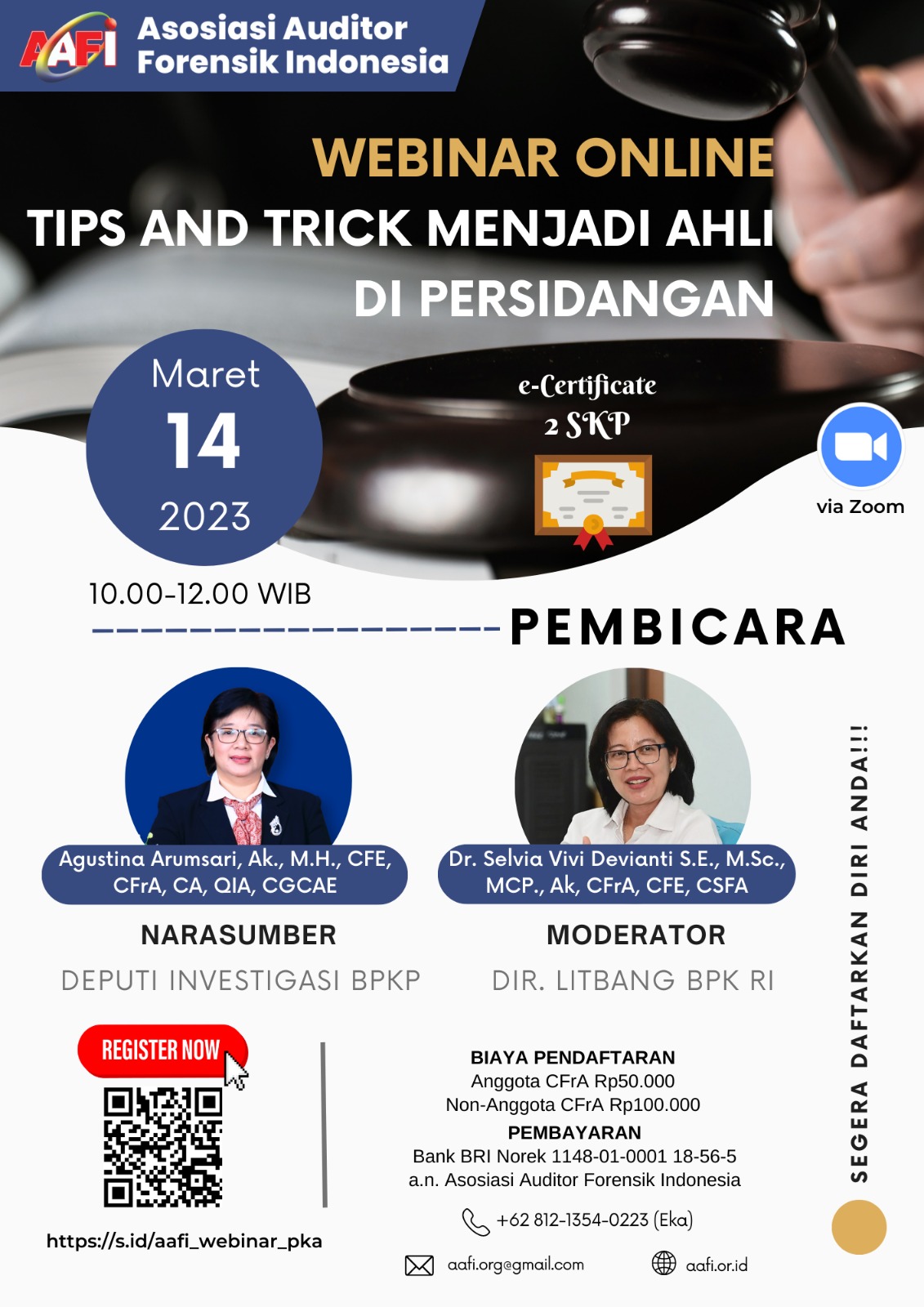 Asosiasi Forensik Auditor Indonesia (AAFI WENOME) mengundang Bapak/Ibu dalam Webinar Online dengan Tema "TIPS AND TRICKS MENJADI AHLI DI PERSIDANGAN"